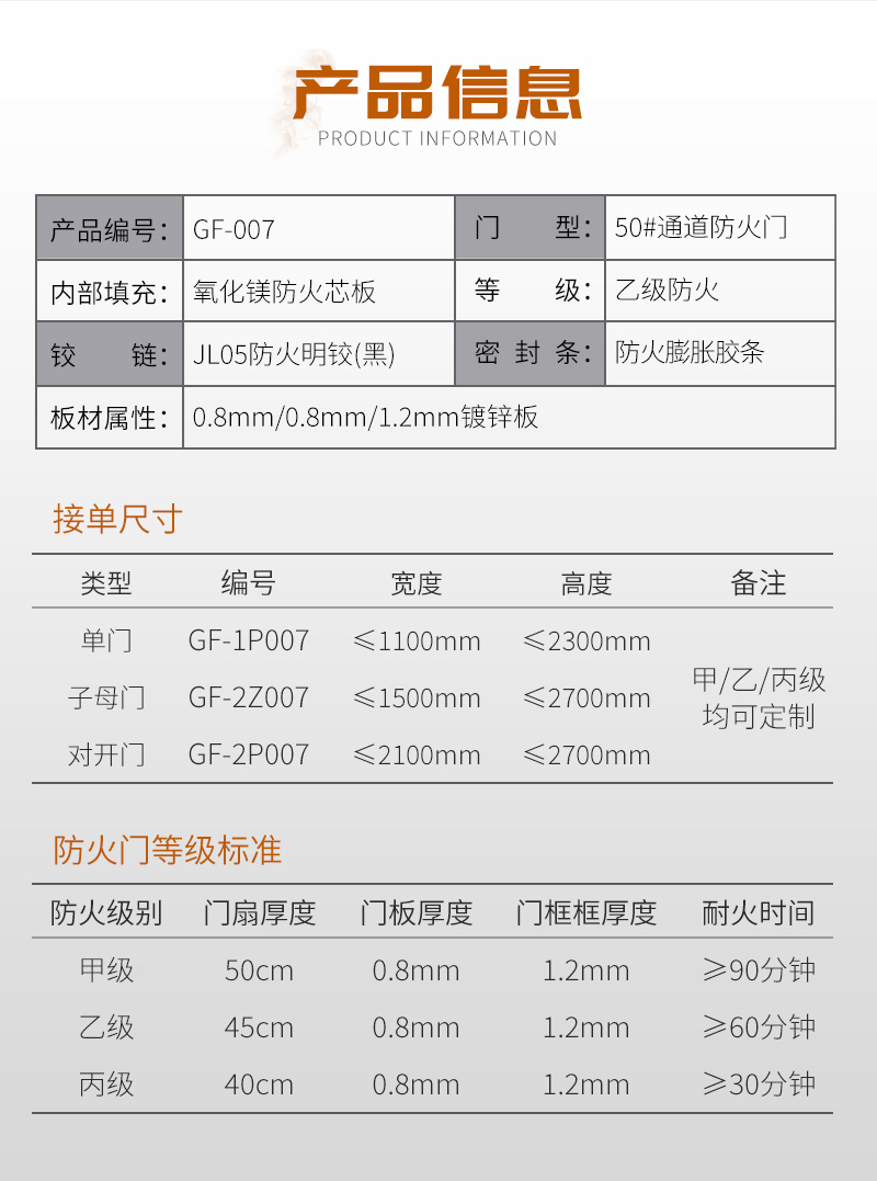 宽度(单门≤1100mm 子母门≤1500mm 对开门≤2100mm)高度(单门≤2300mm 子母门≤2700mm 对开门≤2700mm)
